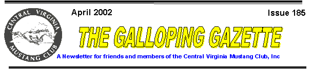 This newsletter has been mailed to all paid members. You will notice that it has grown in size. To help keep the cost down, members who have Internet access are encouraged to get their newsletter from the CVMC website at www.centralvamustang.com . To help make it easier on the editor you are encouraged to e-mail: svt95cobrava@aol.com and let the editor know that you will get your copy of the newsletter from the website. Be sure to put “Newsletter” in the subject line. Members who participate will receive notification via e-mail that the newsletter has been posted.