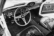 Shelby-destined Mustangs began life on regular Ford production lines, but they were assembled without hoods, grilles, rear seats, exhaust systems, or emblems. Items scrounged from Ford’s parts bins included a Borg-Warner close-ratio four-speed, a Detroit Locker differential, 11-inch front disc brakes, larger drums at the rear and special bracing under the hood. The cars arrived at Shelby-American’s Los Angeles facility with stock 289-inch, 271-horse V-8s, but they were soon treated to the Texan’s recipe of a cast-aluminum oil pan and valve covers, tri-Y headers, glasspack mufflers (exiting to the side of the car just forward of the rear wheels), and a healthy 715-cfm Holley four-barrel on a Cobra aluminum intake. An open-element air cleaner ducted to the fiberglass hoodscoop. Engine output was 306hp at 6,000 rpm, 0-60 mph times came in at 6.8 seconds, the quarter-mile happened in 15 flat at 91 mph, and top speed was close to 135 mph.